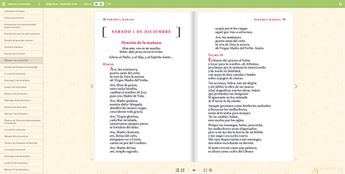 Magnificat es una publicación mensual. Contiene los textos de la misa diaria, meditaciones de grandes autores espirituales de todos los tiempos y la oración de la mañana y de la tarde inspiradas en la liturgia de las Horas.